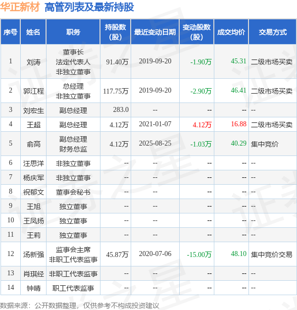 华正新材的高管列表及最新持股情况如下:
