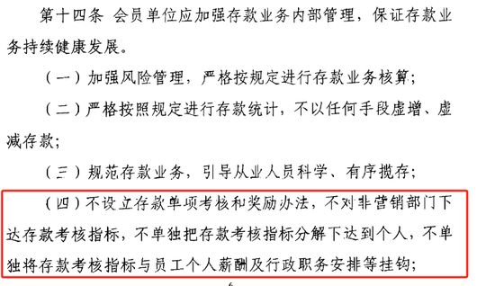 2011 年,中国银行业协会印发《中国银行业存款业务自律公约》,第十四条第四项再次强调:不设立存款单项考核和奖励办法,不对非营销部门下达存款考核指标,不单独把存款考核指标分解下达到个人,不单独将存款考核指标与员工个人薪酬及行政职务安排等挂钩。