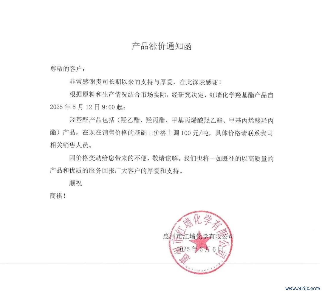 红墙股份发布羟基酯产品涨价通知函红墙股份发布羟基酯产品涨价通知函