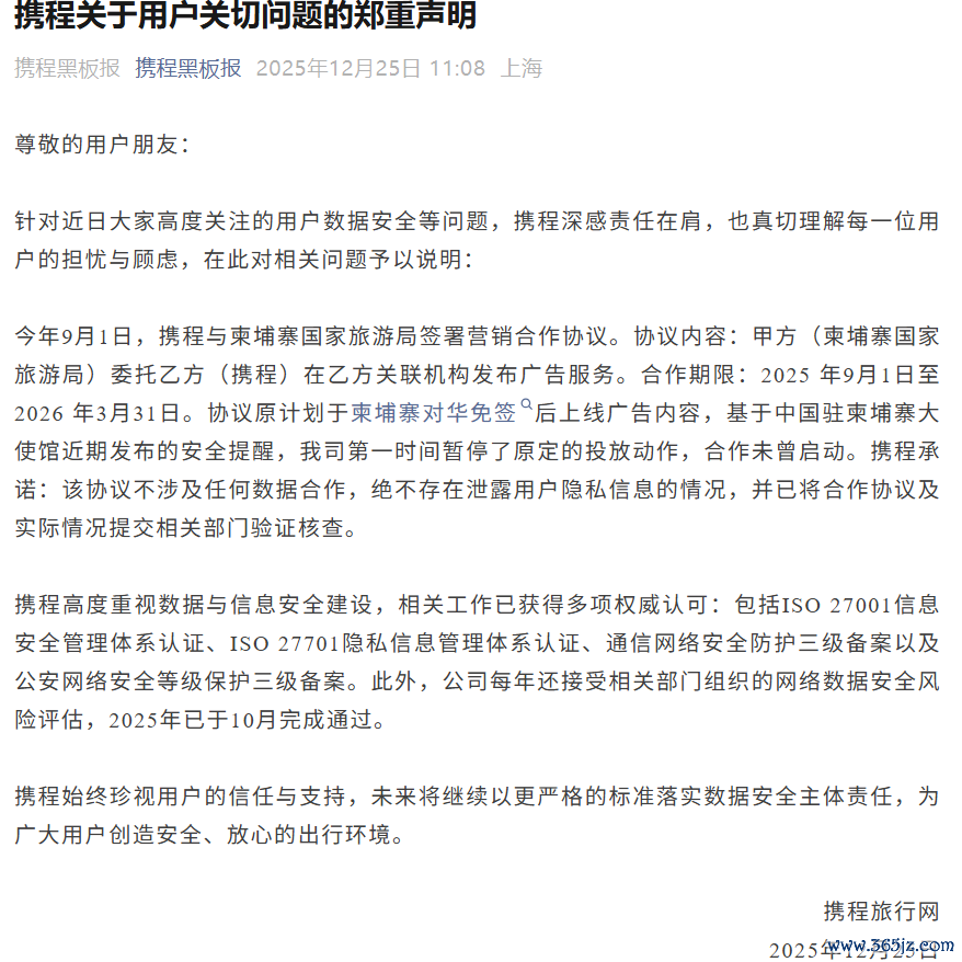 携程声明:与柬埔寨国家旅游局合作未曾启动,不涉及任何数据合作携程声明:与柬埔寨国家旅游局合作未曾启动,不涉及任何数据合作